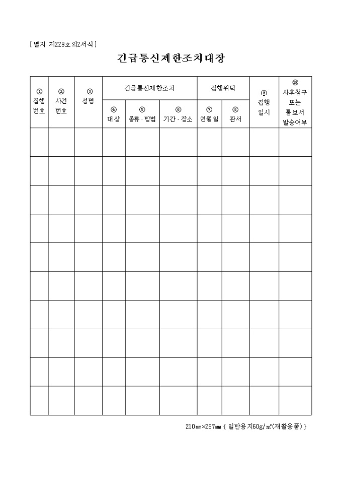 9,000원/월별지 제229호의2 긴급 통신제한 조치대장 양식입니다.