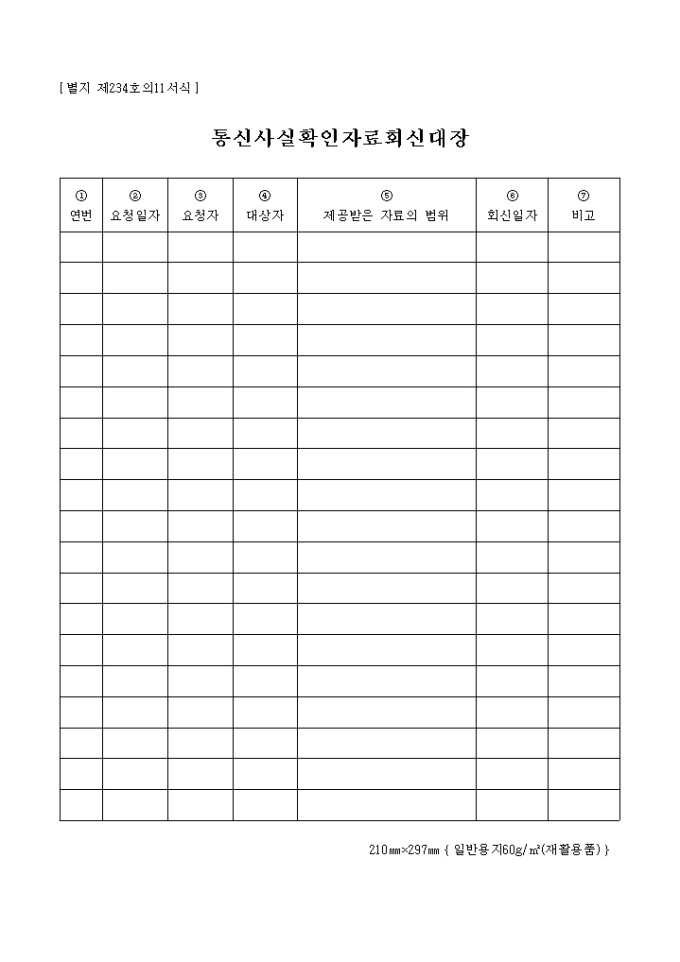 9,000원/월별지 제234호의11 통신 사실 확인자료 회신대장 양식입니다.