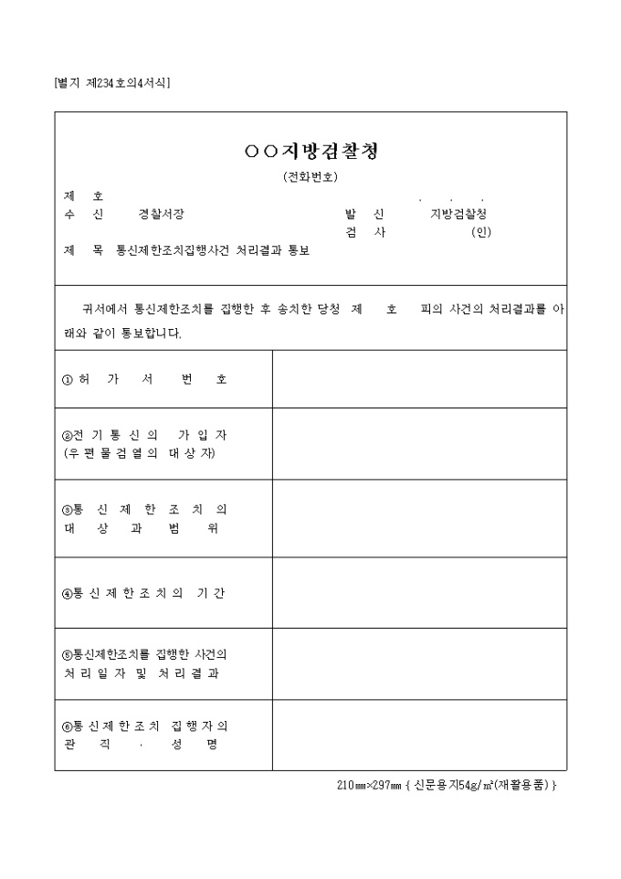 9,000원/월별지 제234호의4 통신제한 조치 집행 사건 처리 결과통보 양식 예제입니다.