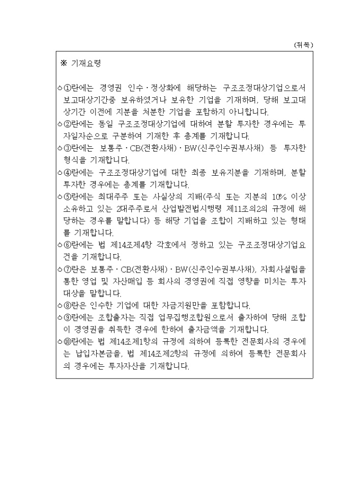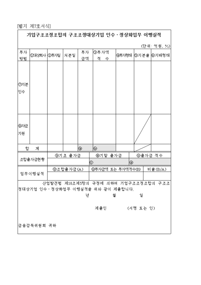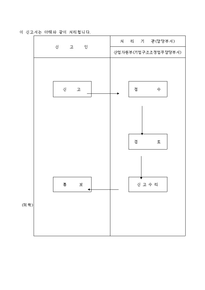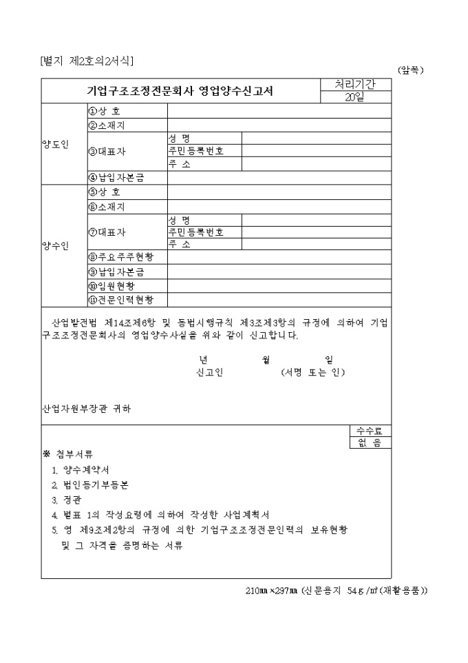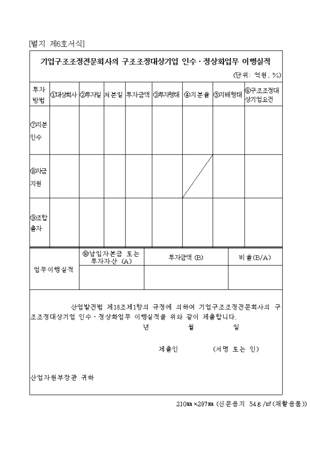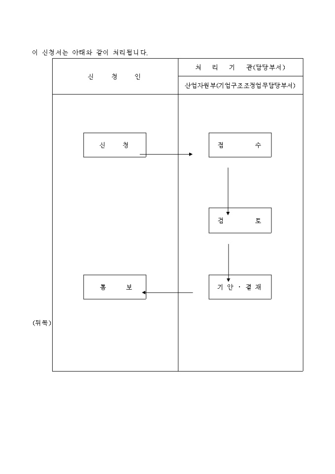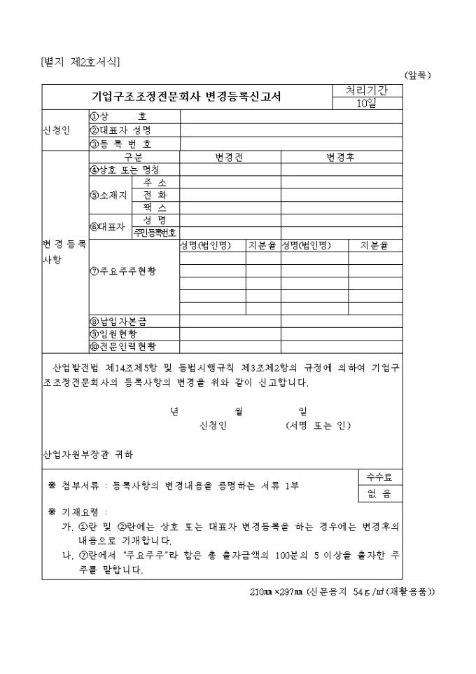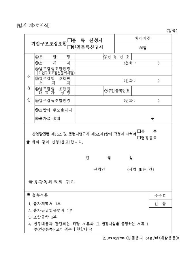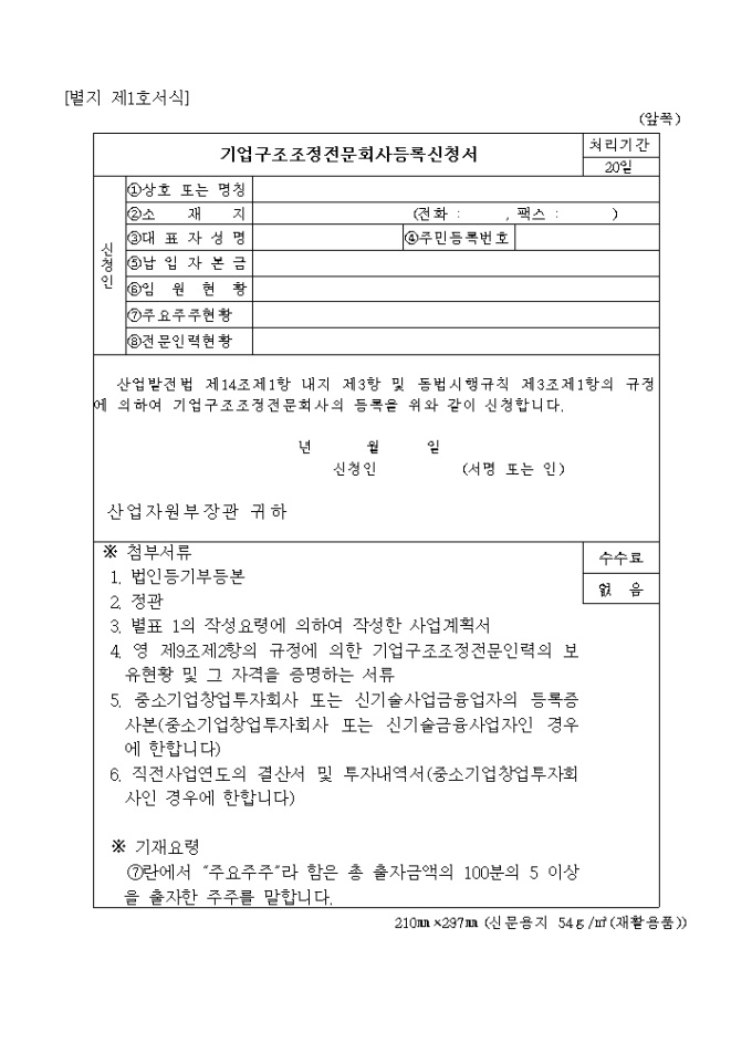 산업발전법 제14조제1항 내지 제3항 및 동법시행규칙 제3조제1항의 규정에 의하여 기업구조조정전문회사의 등록을 위와 같이 신청하고자 할 때 사용하는 "산업발전법 시행규칙 중개정령" 양식입니다.