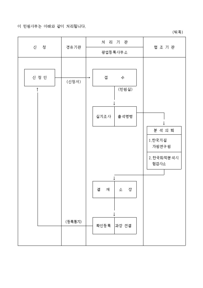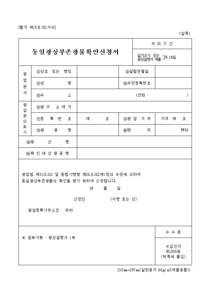 광업법 제33조의2 및 동법시행령 제26조의2제1항의 규정에 의하여 동일광상부존광물의 확인을 받기 위하여 신청할 때 사용하는 "별지제15호의2 동일광상부존 광물 확인신청서" 양식입니다.