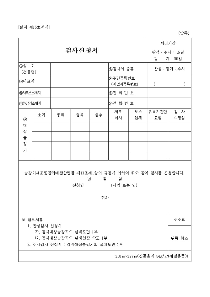 9,000원/월승강기제조및관리에관한법률 제13조제1항의 규정에 의하여 위와 같이 검사를 신청할 때 사용하는 "별지제15호 검사신청서(승강기 제조 및 관리)" 양식입니다.