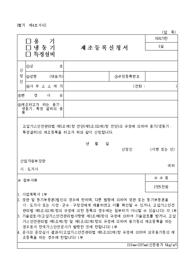 9,000원/월고압가스안전관리법 제5조제1항 전단(제5조의2제1항 전단)의 규정에 의하여 용기(냉동기․특정설비)의 제조등록을 하고자 위와 같이 신청할 때 사용하는 "별지제4호 용기 냉동기 특정설비 제조등록신청서" 양식입니다.