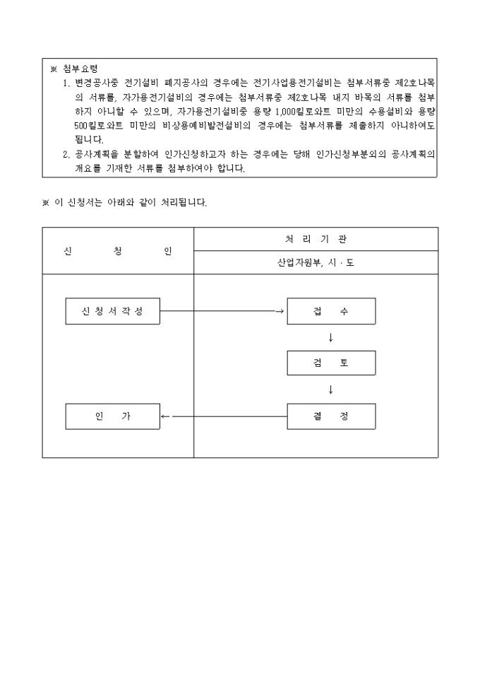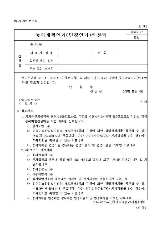 전기사업법 제61조․제62조 및 동법시행규칙 제29조의 규정에 의하여 공사계획인가(변경인가)를 받고자 신청할 때 사용하는 "별지제25호 공사계획 인가(변경인가)신청서" 양식입니다.