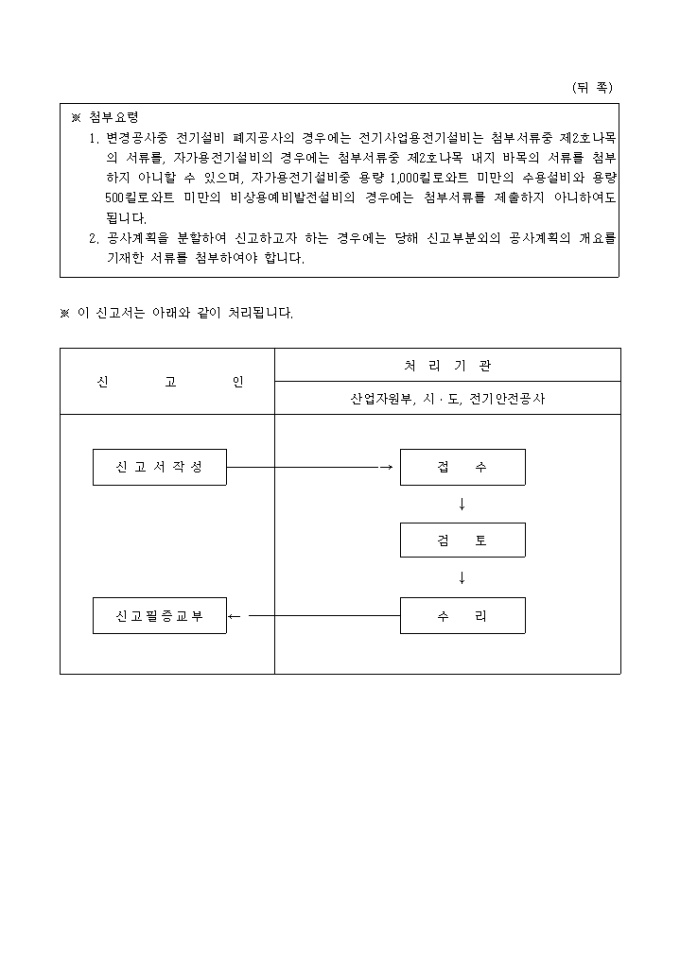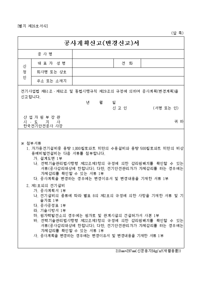 전기사업법 제61조․제62조 및 동법시행규칙 제29조의 규정에 의하여 공사계획(변경계획)을 신고할 때 사용하는 "별지제26호 공사계획 신고(변경신고)서" 양식입니다.