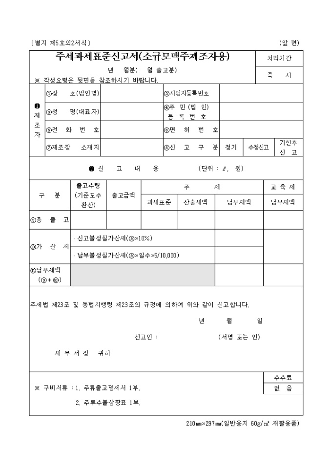 9,000원/월별지 제5호의2 주세 과세 표준신고서(소규모 맥주 제조자용) 양식 예제입니다.