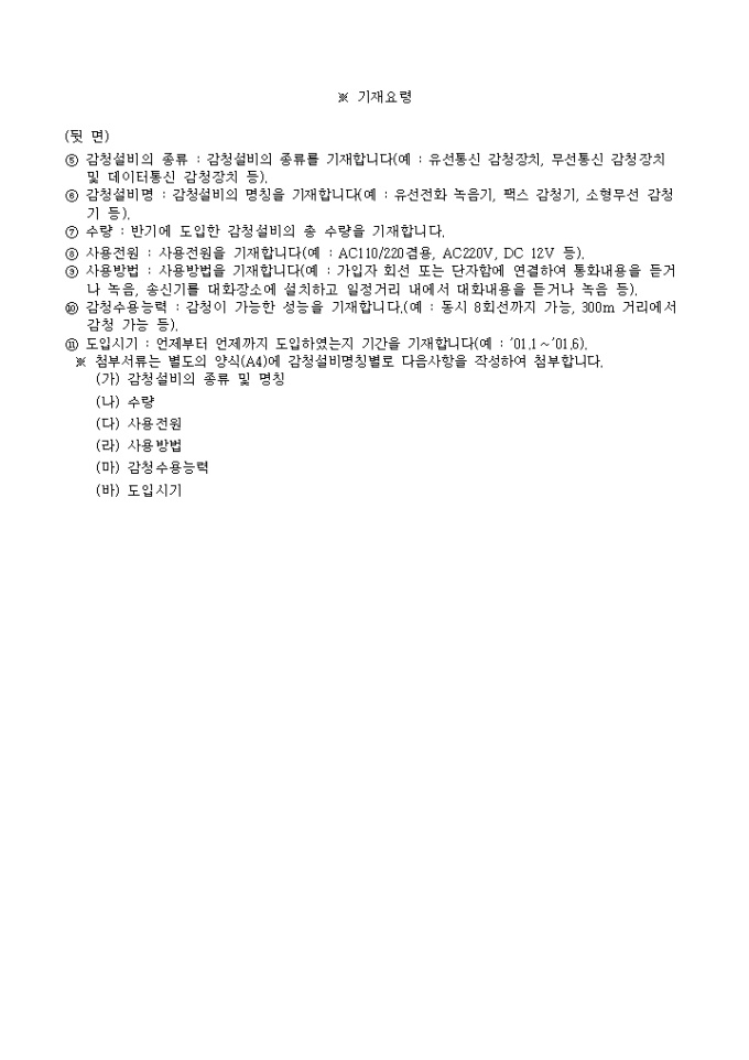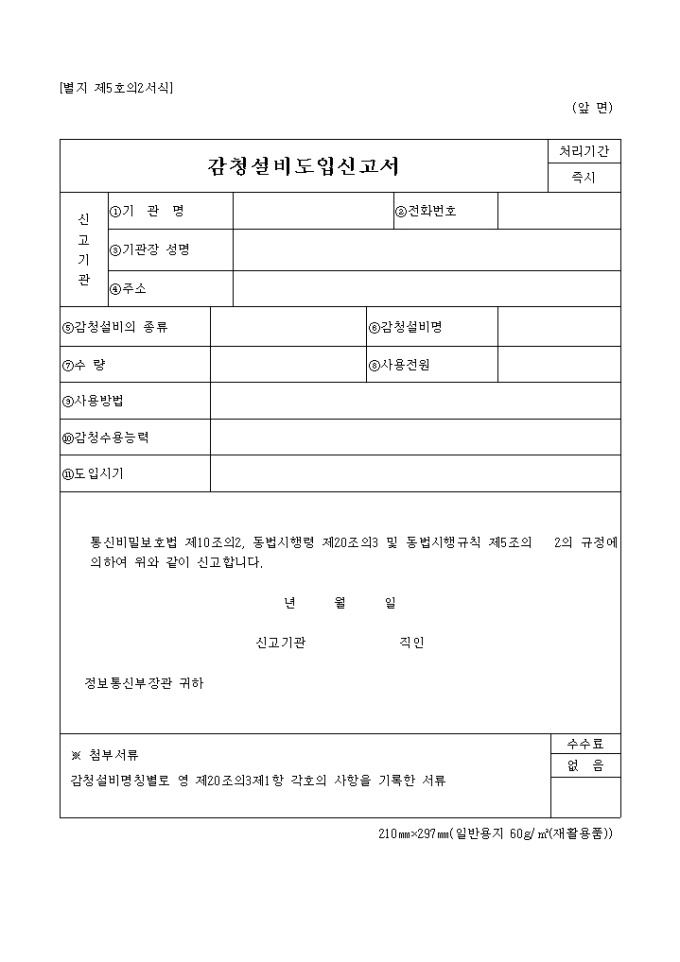9,000원/월별지 제5호의2 감청 설비 도입신고서 양식 예제입니다.