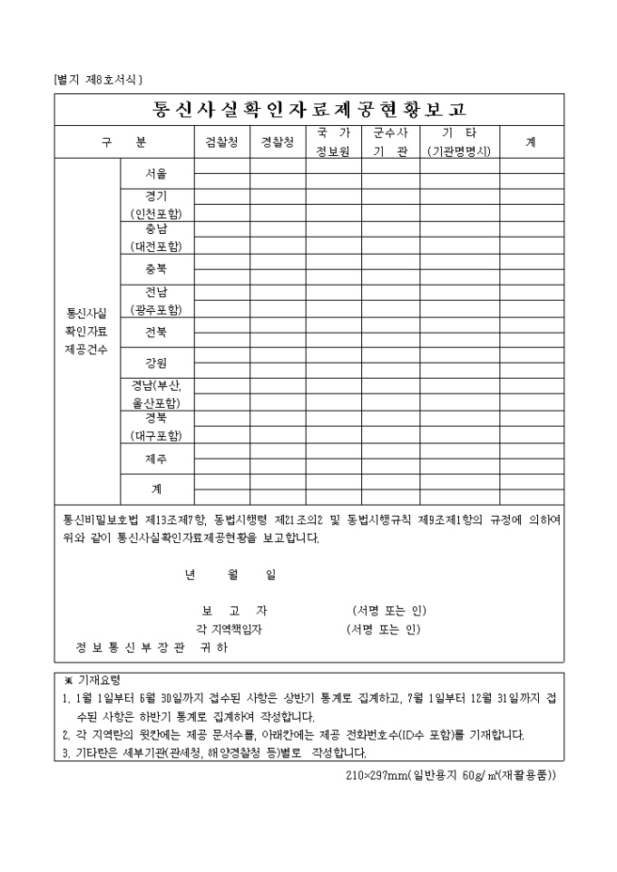통신비밀보호법 제13조제7항, 동법시행령 제21조의2 및 동법시행규칙 제9조제1항의 규정에 의하여 위와 같이 통신사실확인자료제공현황을 보고합니다.