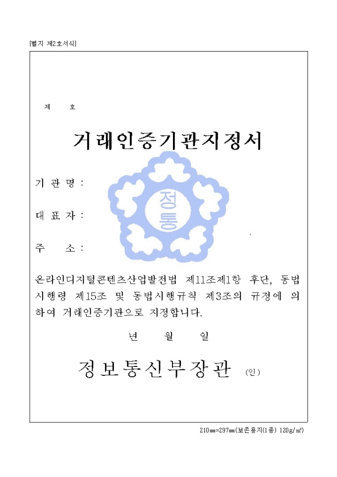 온라인디지털콘텐츠산업발전법 제11조제1항 후단, 동법시행령 제15조 및 동법시행규칙 제3조의 규정에 의하여 거래인증기관으로 지정합니다.