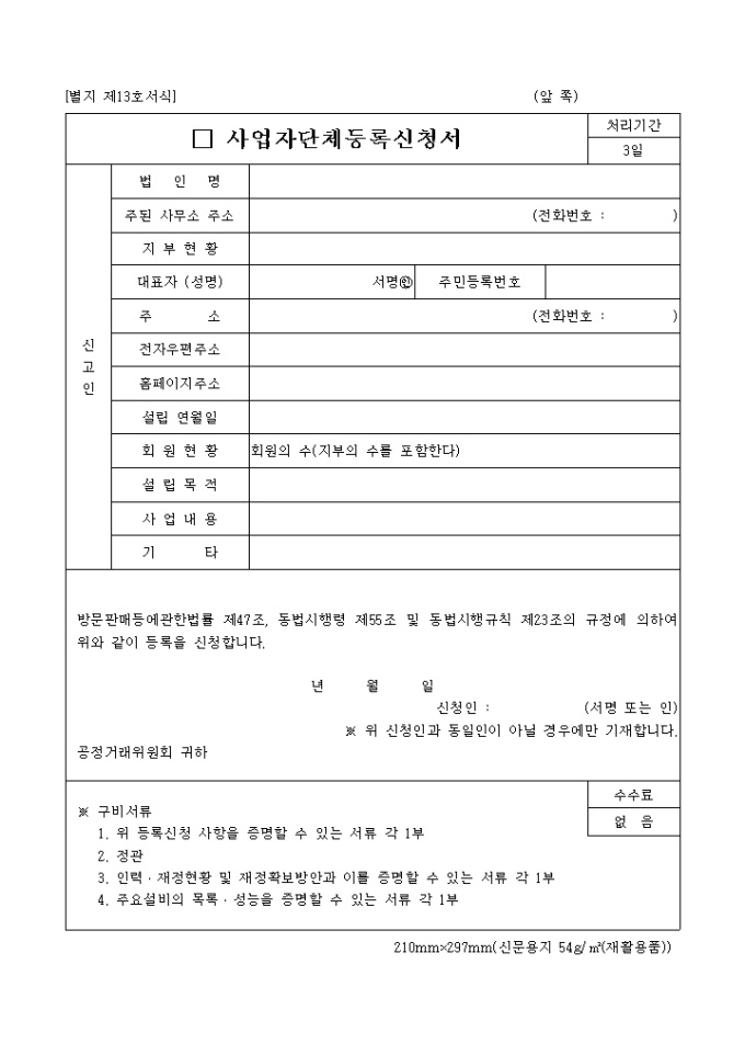 방문판매등에관한법률 제47조, 동법시행령 제55조 및 동법시행규칙 제23조의 규정에 의하여 위와 같이 등록을 신청할 때 사용하는 "별지제13호 사업자 단체 등록신청서" 양식입니다.