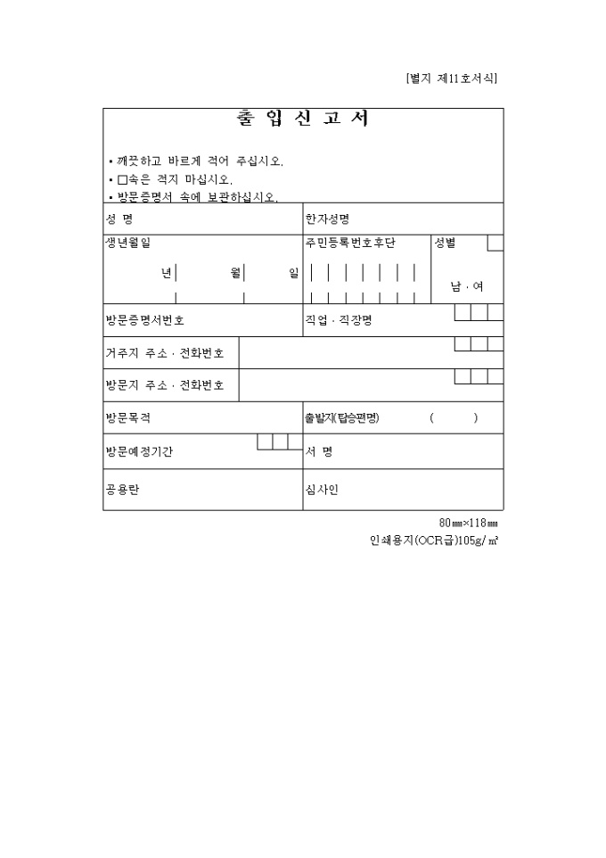 9,000원/월별지 제11호 출입신고서 양식입니다.