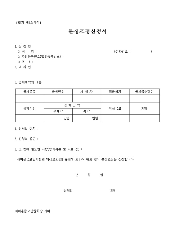 9,000원/월새마을금고법시행령 제40조의4의 규정에 의하여 위와 같이 분쟁조정을 신청할 때 사용하는 "별지제3호 분쟁 조정신청서" 양식입니다.