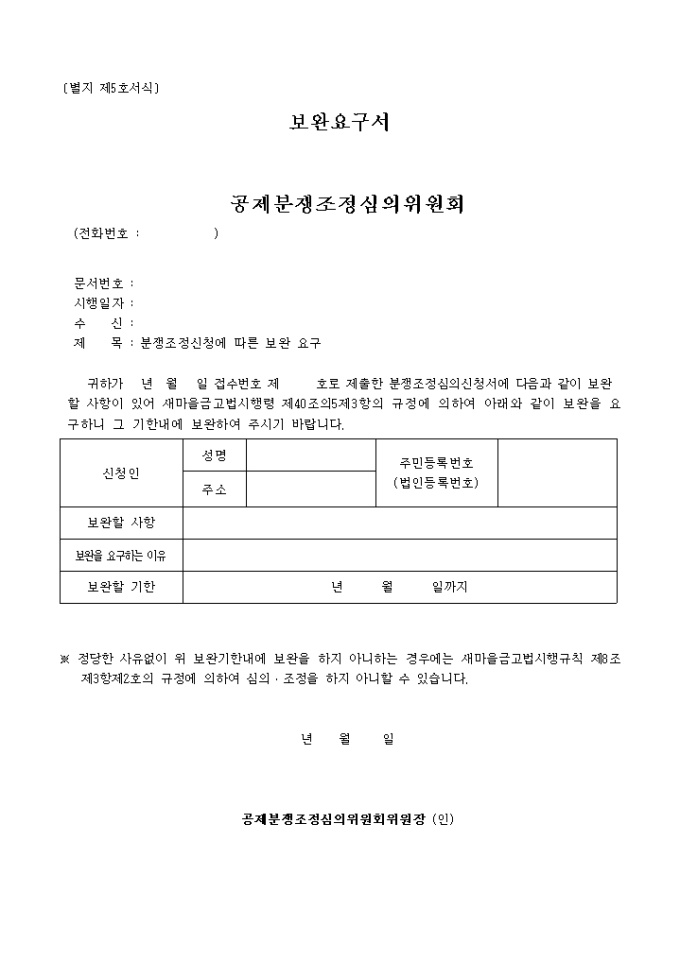 9,000원/월귀하가 년 월 일 접수번호 제 호로 제출한 분쟁조정심의신청서에 다음과 같이 보완할 사항이 있어 새마을금고법시행령 제40조의5제3항의 규정에 의하여 아래와 같이 보완을 요구하니 그 기한내에 보완을 요청하고자 할 때 사용하는 "별지제5호 분쟁 조정 신청에 따른 보완요구" 양식입니다.