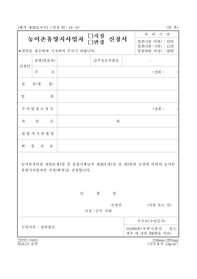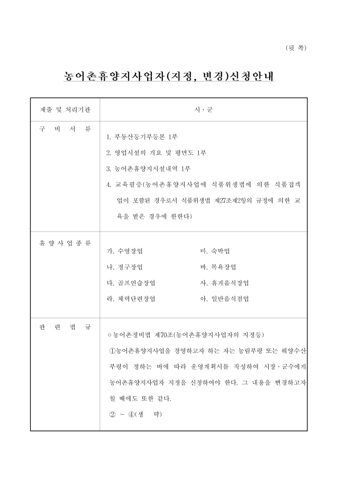 농어촌정비법 제70조제1항 및 동법시행규칙 제39조제1항 및 제2항의 규정에 의하여 농어촌휴양지사업자의 지정(변경)을 신청하고자 할 때 사용하는 "농어촌 휴양지 사업자(지정,변경)신청서" 양식입니다.