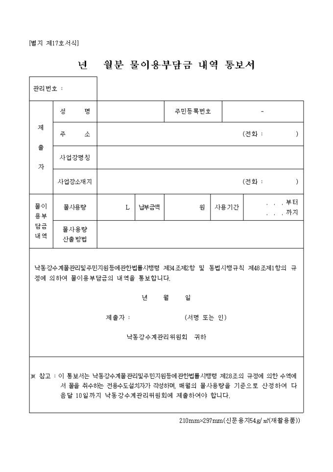 9,000원/월낙동강수계물관리및주민지원등에관한법률시행령 제34조제2항 및 동법시행규칙 제48조제1항의 규정에 의하여 물이용부담금의 내역을 통보할 때 사용하는 "별지제17호 년월분 물 이용 부담금 내역통보서" 양식입니다.