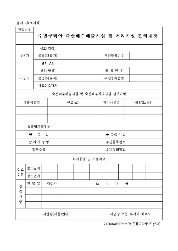 수변구역안축산폐수배출시설 및 처리시설관리대장(별지 제4호)
