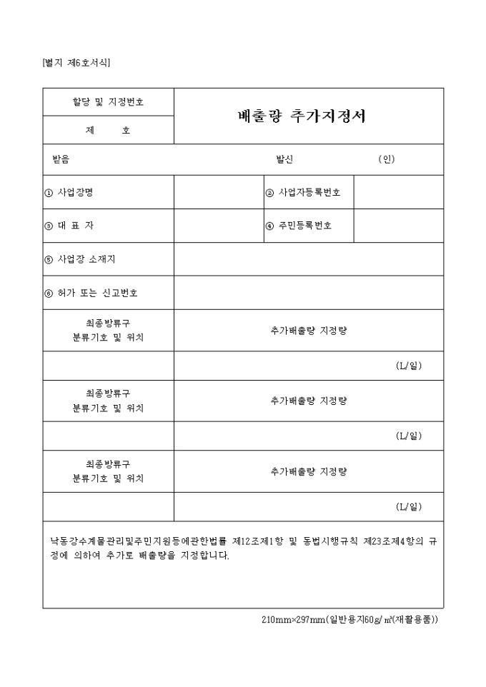 9,000원/월낙동강수계물관리및주민지원등에관한법률 제12조제1항 및 동법시행규칙 제23조제4항의 규정에 의하여 추가로 배출량을 지정할 때 사용하는 "별지제6호 배출량 추가지정서" 양식입니다.