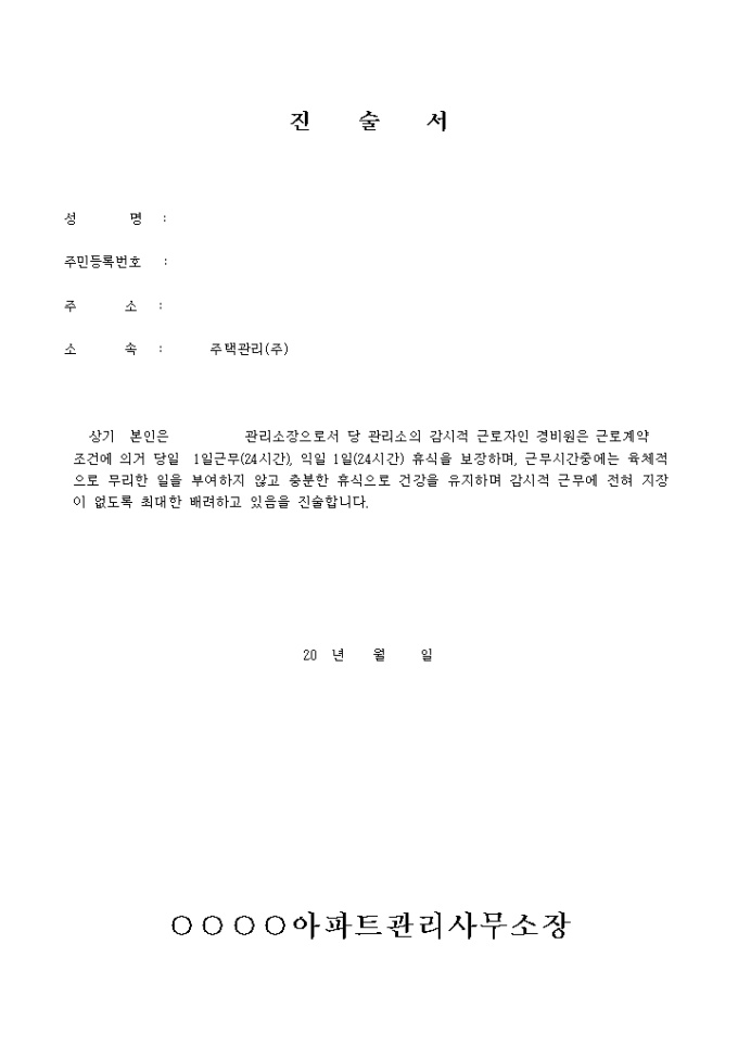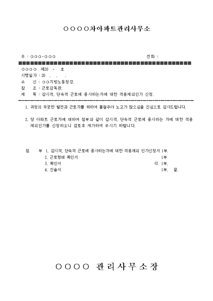 2. 당 아파트 근로자에 대하여 첨부와 같이 감시적, 단속적 근로에 종사하는 자에 대한 적용제외인가를 신청하오니 검토후 재가하여 주시기 바랍니다.