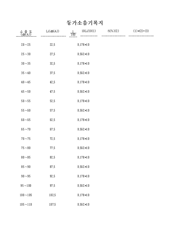 등가소음기록지 양식입니다. 소음도, Li(㏈(A)), 0Li/10(1)등의 항목으로 구성되어 있습니다.