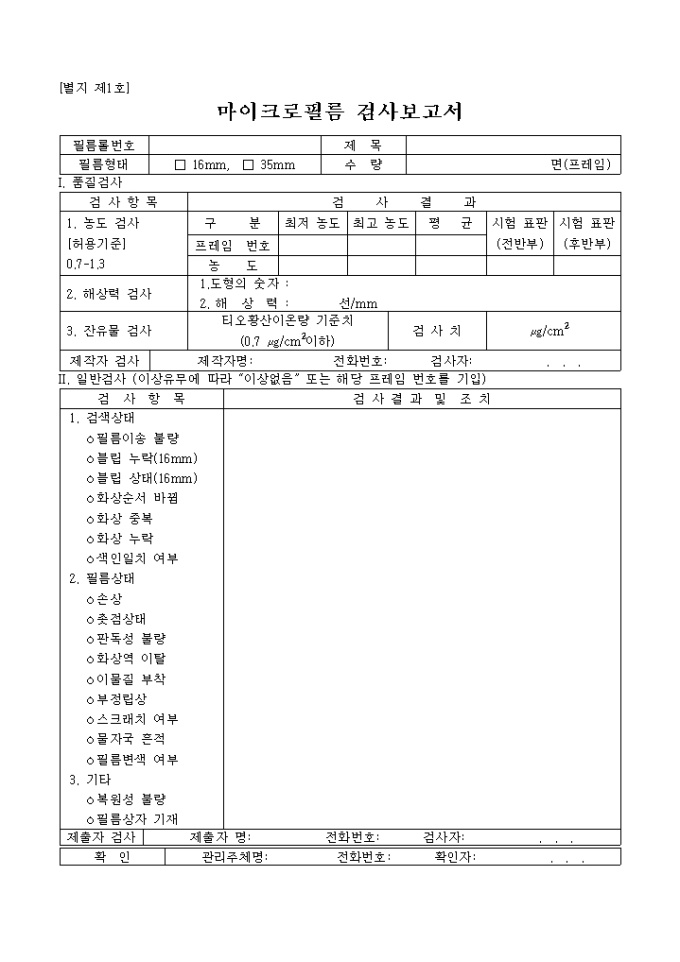 마이크로 필름 검사보고서 양시입니다. 다음의 내용을 참고하세요.