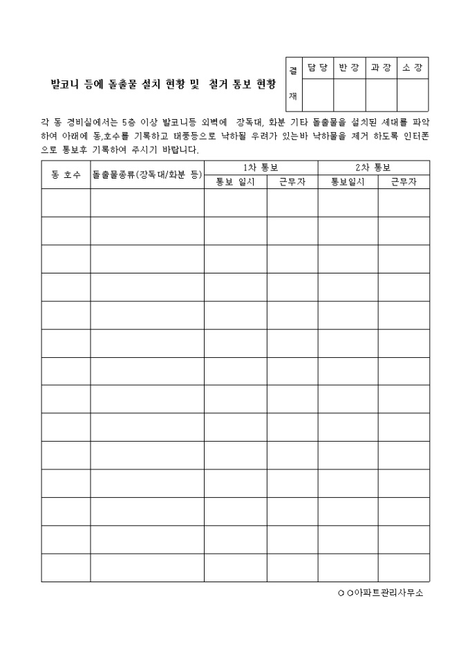 동 호수별 돌출물 종류와 1차, 2차 통보내용을 기록한 발코니등에돌출물설치현황및철거통보현황양식입니다.