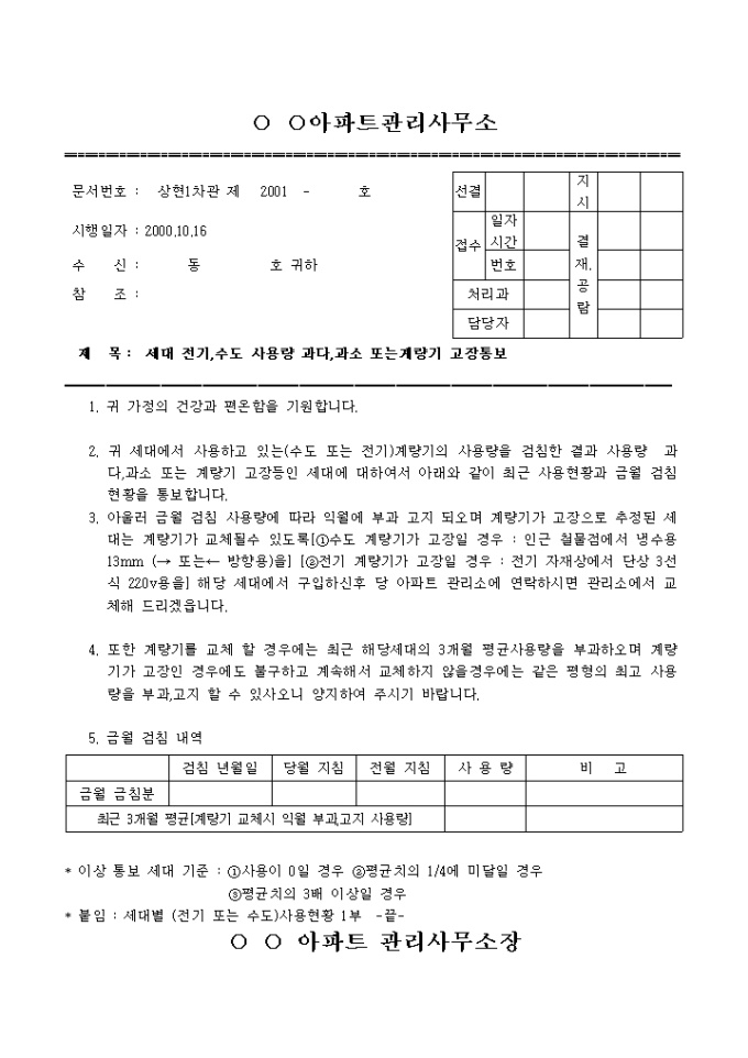 2. 귀 세대에서 사용하고 있는(수도 또는 전기)계량기의 사용량을 검침한 결과 사용량 과다,과소 또는 계량기 고장등인 세대에 대하여서 아래와 같이 최근 사용현황과 금월 검침현황을 통보합니다.