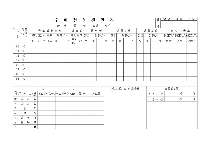 9,000원/월특고압운저반, 정류반, 동력반, 전등반, 변압기 온도등의 항목으로 구성되어 있는 수배전문전일지 양식입니다.