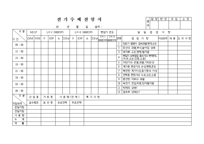 전기수배전일지 입니다. 점 검 사 항 단호기 칼받이 접속과열, 변색, 오손 모선의 과열, 부식, 늘어짐 상태 애자류 소손, 변형, 헐거움 변압기 외부점검 흡수기의 변색온도 (누유, 오손, 진동, 소음) 차단기의 균열, 과열, 기타손상 계기용 변성기의 손상, 변형, 온도 배전반 계기이상, 표시등의 이상 전력용 콘덴서의 누유, 오손, 소음 ...