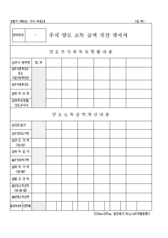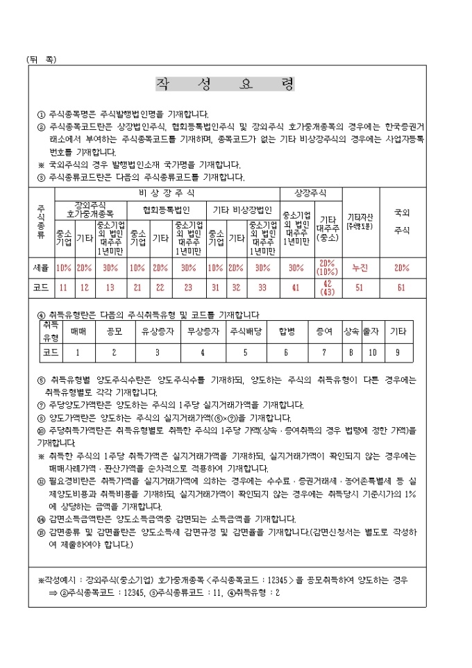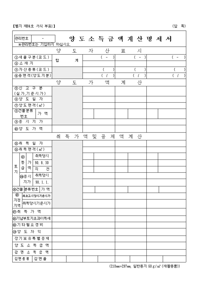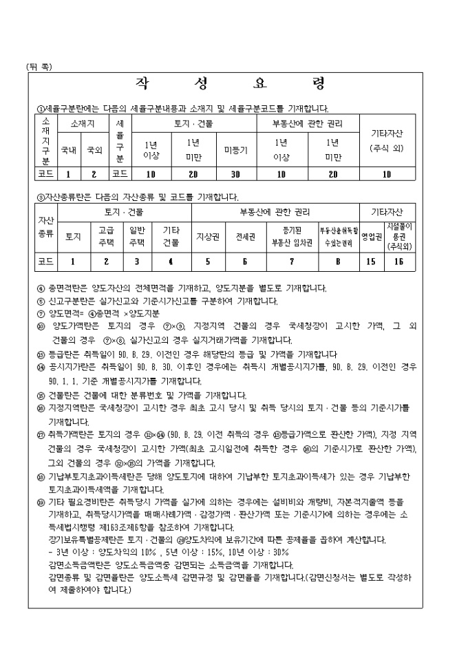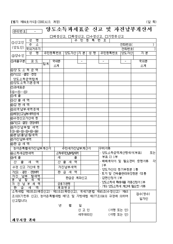 소득세법 제105조(예정신고)․제110조(확정신고), 국세기본법 제45조(수정신고)․제45조의3(기한후 신고), 농어촌특별세법 제7조 및 지방세법 제177조의4의 규정에 의하여 신고하실때 사용하는 양식입니다.