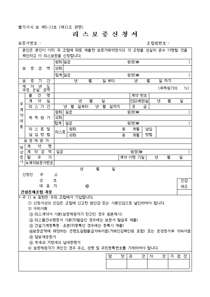 조합에 따로 제출한 보증거래약정서의 각 조항을 성실히 준수 이행할 것을 확인하고 이 리스보증을 신청할 때 사용하는 양식입니다.