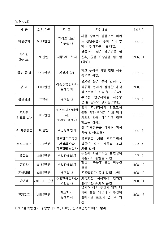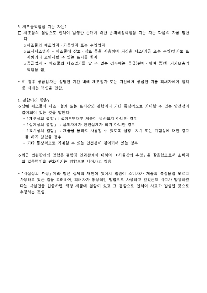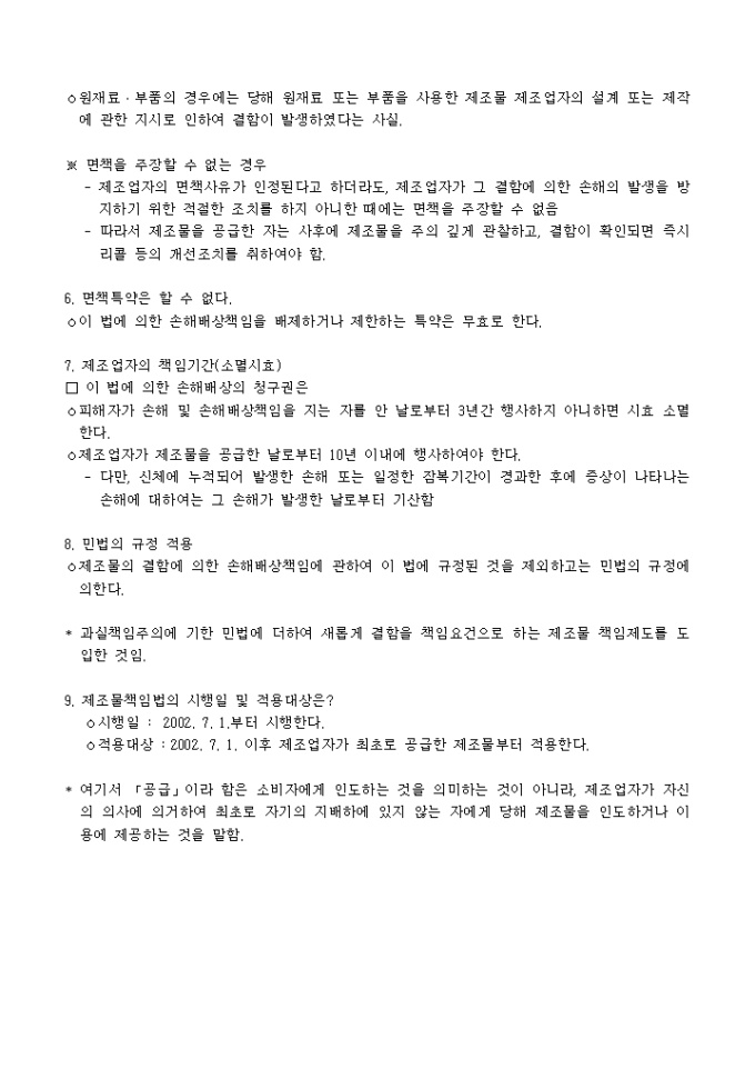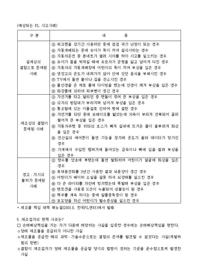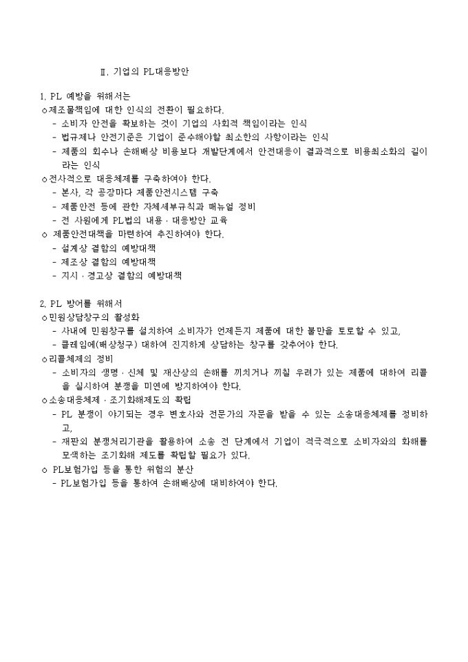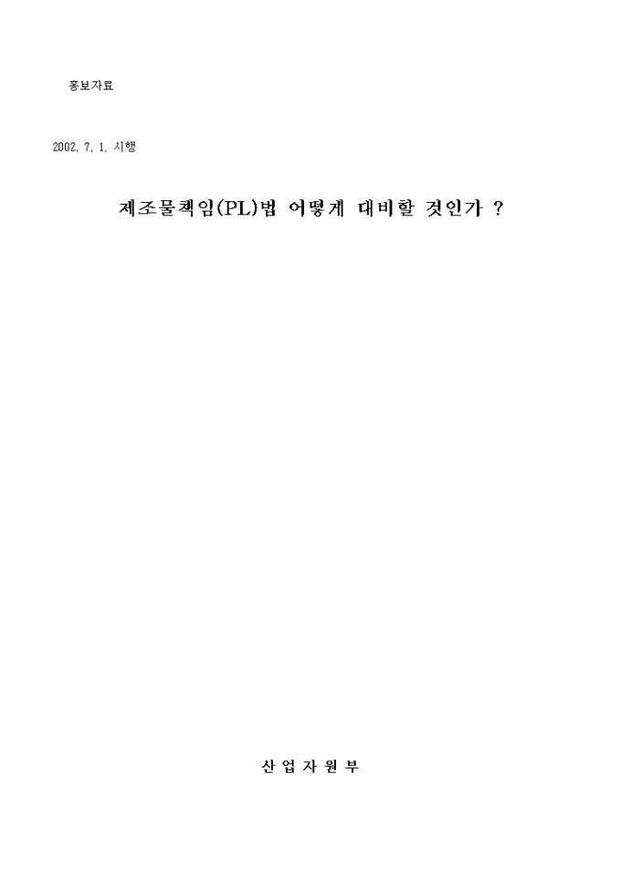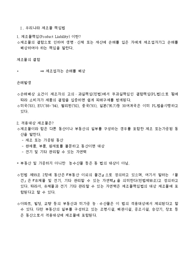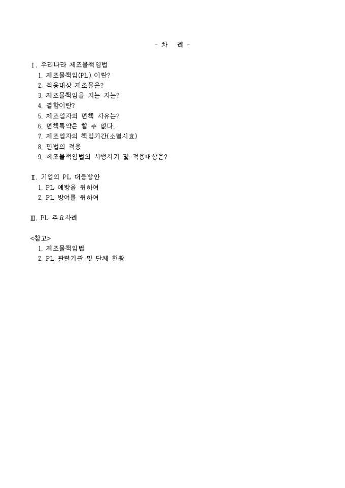 9,000원/월제조물책임(PL)법 어떻게 대비할 것인가 ? -차례- Ⅰ. 우리나라 제조물책임법 1. 제조물책임(PL) 이란? 2. 적용대상 제조물은? 3. 제조물책임을 지는 자는? 4. 결함이란? 5. 제조업자의 면책 사유는? 6. 면책특약은 할 수 없다. 7. 제조업자의 책임기간(소멸시효) 8. 민법의 적용 9. 제조물책임법의 시행시기 및 적용대상은? Ⅱ. 기업의 PL 대응방안 1. PL 예방을 위하여 2. PL 방어를 위하여