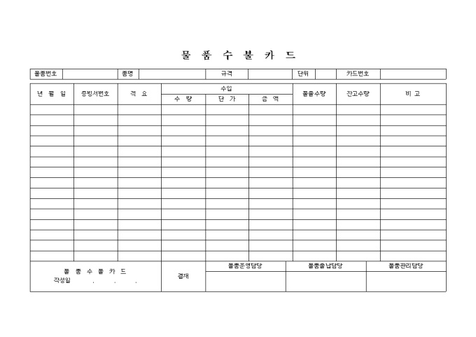수입물의 수량, 단가, 금액과 불출수량, 잔고수량 등을 기록하는 물품수불카드입니다.