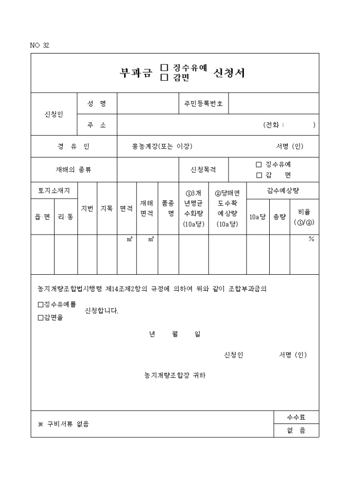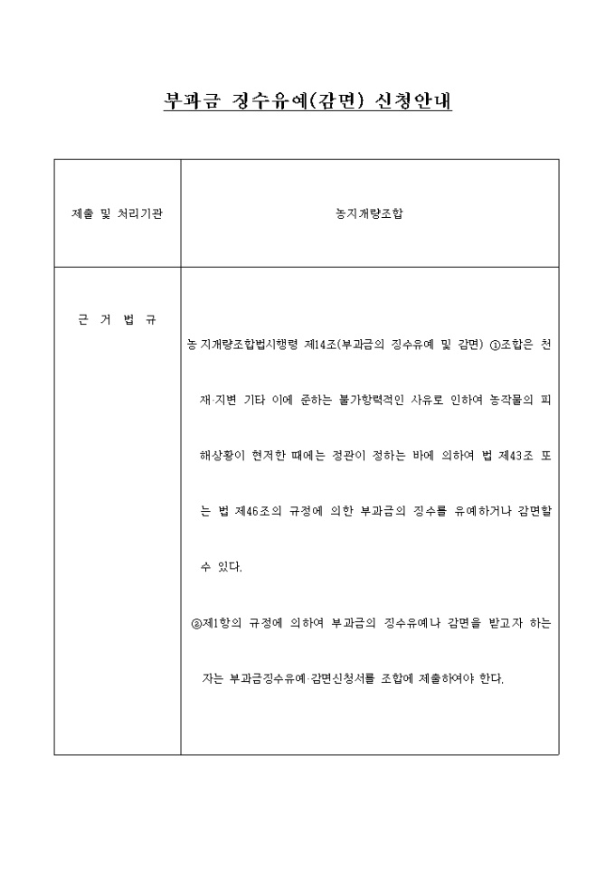 9,000원/월농지개량조합법시행령 제14조제2항의 규정에 의하여 위와 같이 조합부과금의 (□징수유예를, □감면을) 신청하고자 할 때 사용하는 "부과금(징수유예,감면)신청서" 양식입니다.