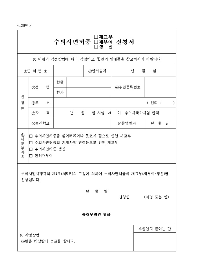 수의사면허증(재교부, 재부여, 갱신)신청서