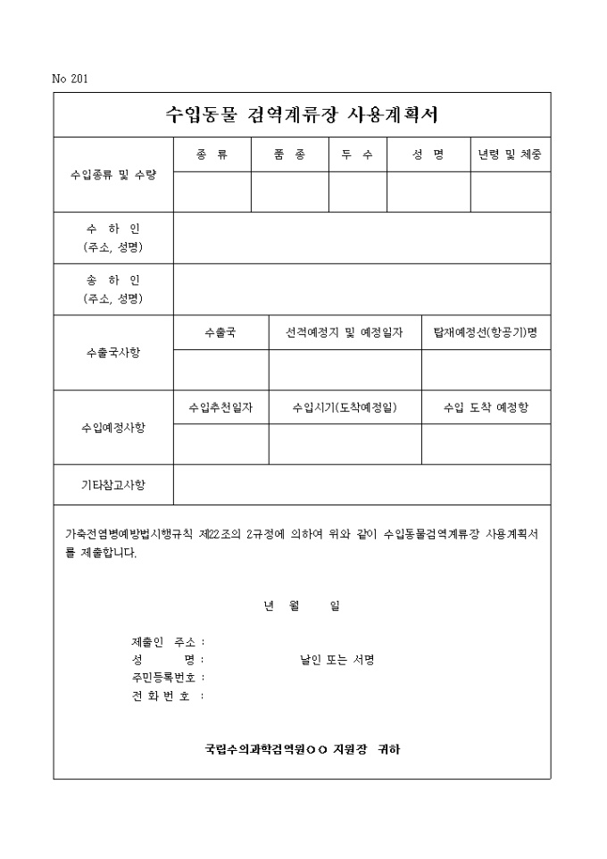가축전염병예방법시행규칙 제22조의 2규정에 의하여 위와 같이 수입동물검역계류장 사용계획서를 제출하고자 할 때 사용하는 "수입동물 검역계류장 사용계획서" 양식입니다.
