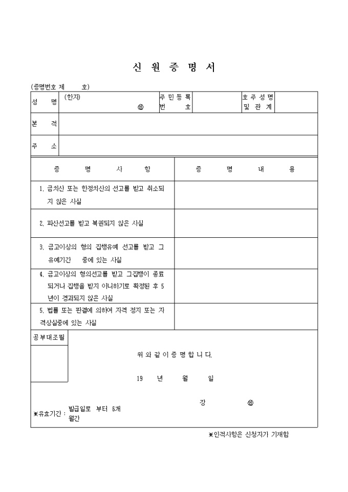9,000원/월신원을 증명하는 양식입니다. 개인정보와 증명사항을 기입하고 거기에 대한 증명내용을 작성합니다. (유효기간:발급일로부터 6개월간)