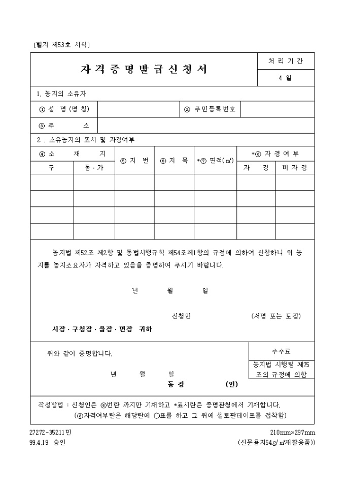 9,000원/월농지법 제52조제2항 및 동법시행규칙 제54조제1항의 규정에 의하여 신청하니 위 농지를 농지소유자가 자경하고 있음을 증명 신청하고자 할 때 사용하는 자격증명 발급신청서 양식입니다.