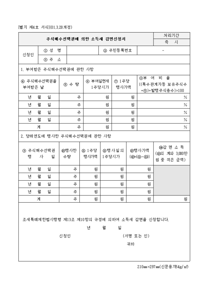 주택매수 선택권에 의한 소득금액감면신청서_2001년3월28일 양식 예제입니다.