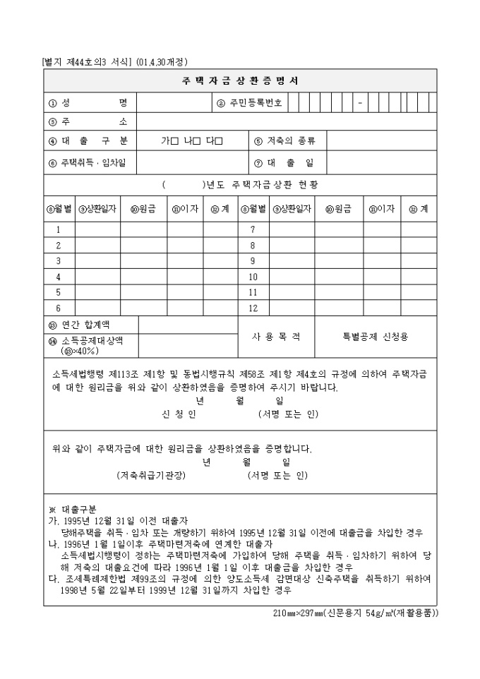 9,000원/월주택 자금 상환증명서_2001년4월30일 양식 예제입니다. 소득세법행령 제113조 제1항 및 동법시행규칙 제58조 제1항 제4호의 규정에 의하여 주택자금에 대한 원리금을 위와 같이 상환하였음을 증명하여 주시기 바랍니다. 년 월 일 신 청 인 (서명 또는 인) 위와 같이 주택자금에 대한 원리금을 상환하였음을 증명합니다. 년 월 일 (저축취급기관장)
