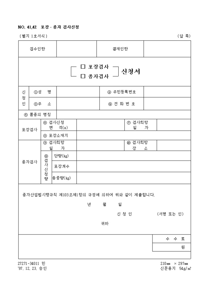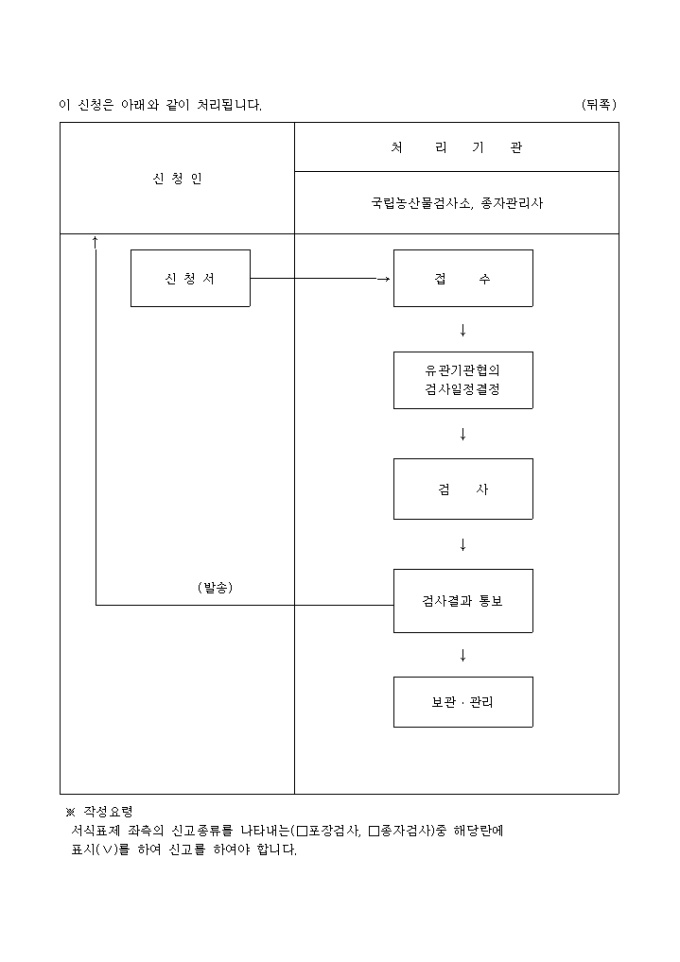 종자산업법시행규칙 제103조제1항의 규정에 의하여 위와 같이 제출하고자 할 때 사용하는 "포장,종자 검사신청" 양식입니다.