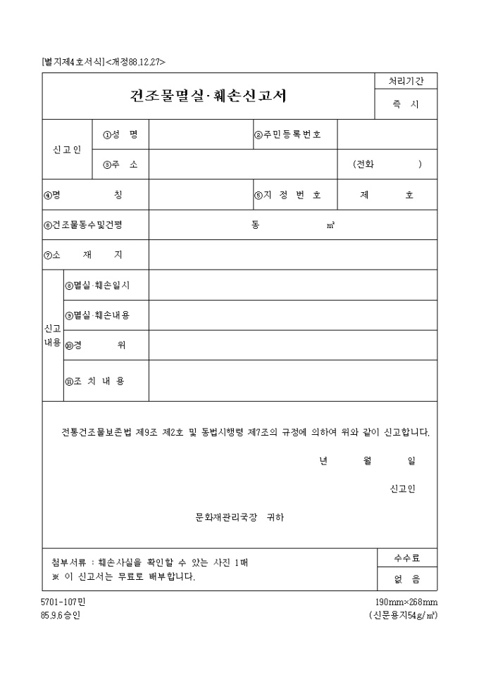건조물멸실, 훼손신고서