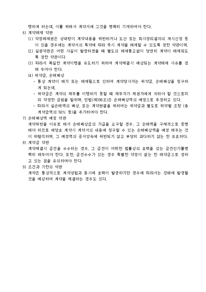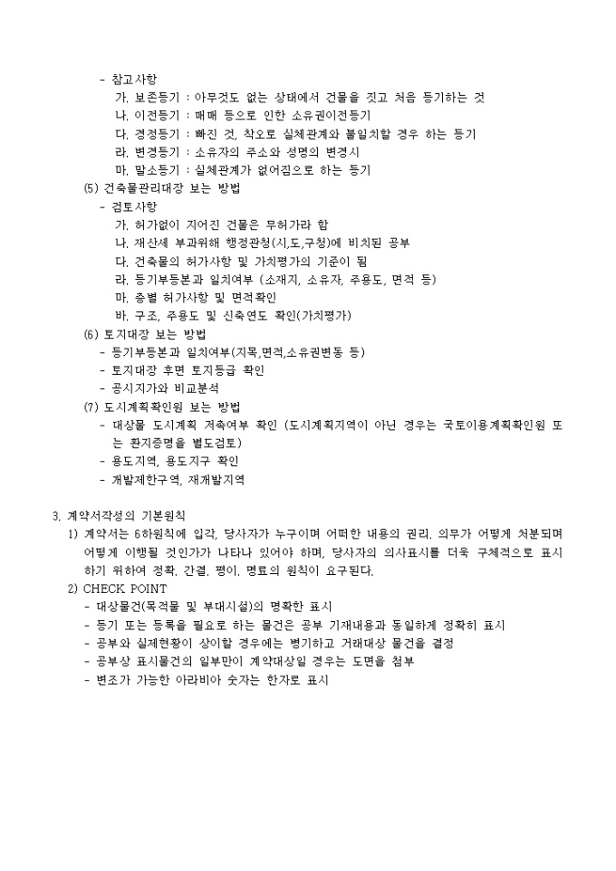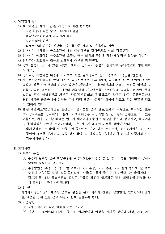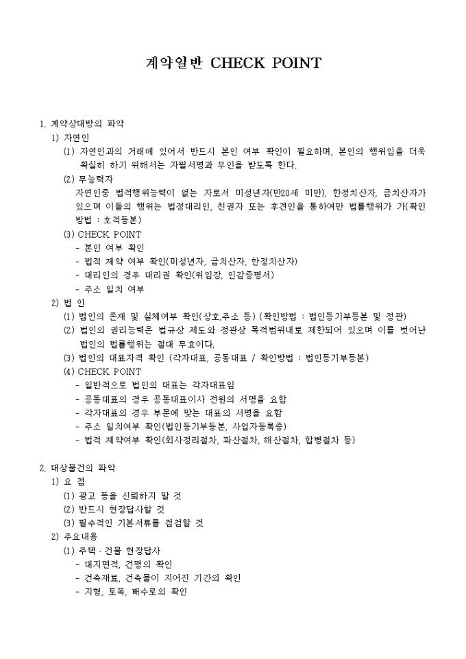 9,000원/월계약일반에서 꼭 검토해야할 CHECK POINT 내용입니다. 계약상대방의 파악, 대상물건의 파악, 계약서 작성의 기본원칙등 크게 7가지의 항목이 명시되어 있습니다.