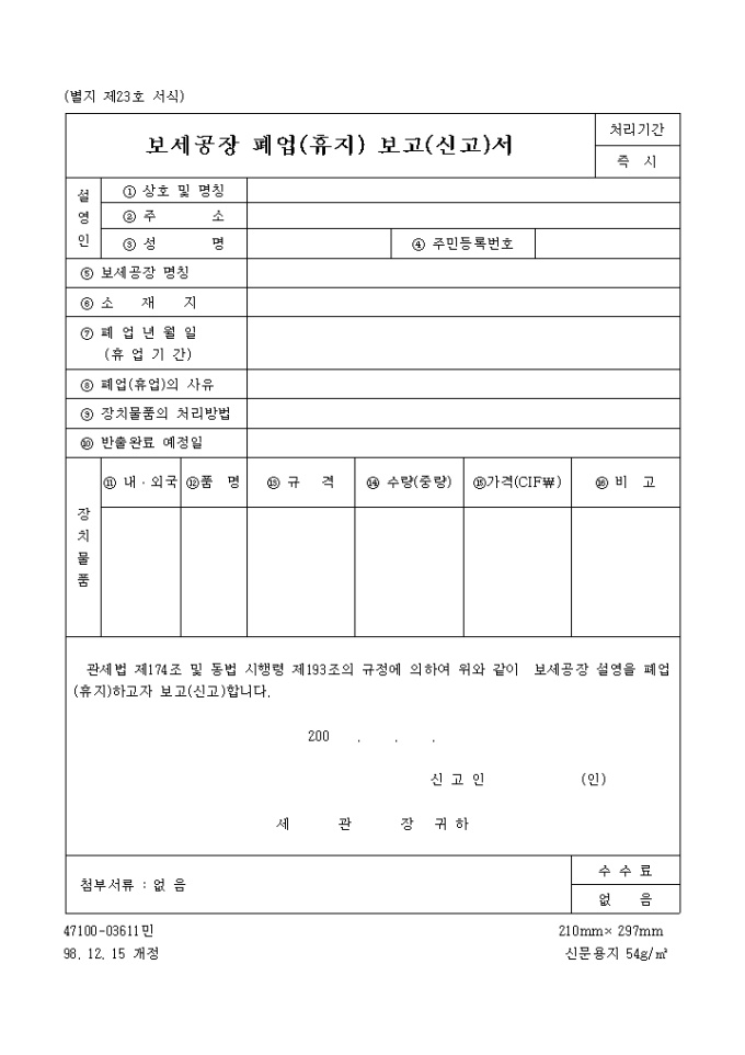 관세법 제174조 및 동법 시행령 제193조의 규정에 의하여 위와 같이 보세공장 설영을 폐업(휴지)하고자 보고(신고)합니다.
