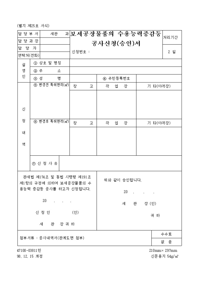 보세공장물품의 수용능력증감등 공사신청(승인)서 양식입니다.