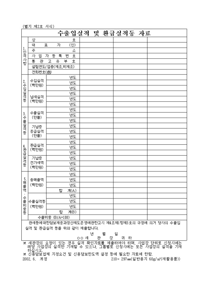 ※ 세관장의 요청이 있는 경우 실적 확인자료를 제출하여야 하며, 사업장 단위로 신청시에는 해당 사업장의 실적만 기재할 수 있으나, 그룹별로 신청시에는 모든 사업장의 실적을 기재하십시오.