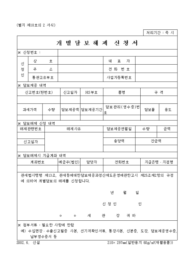 관세법시행령 제13조, 관세등에대한담보제공과정산제도운영에관한고시 제25조제2항의 규정에 의하여 개별담보의 해제를 신청합니다.