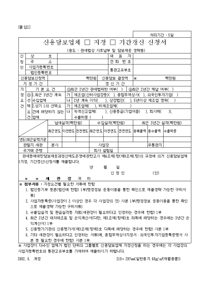 관세등에대한담보제공과정산제도운영에관한고시 제4조제1항(제9조제1항)의 규정에 의거 신용담보업체(지정, 기간갱신)신청서를 제출합니다.