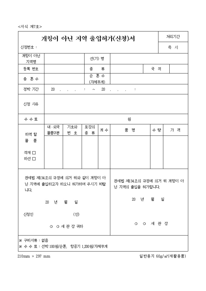 9,000원/월제 7호. 개항지역이 아닌 지역의 출입허가(신청)서(2003.2.4등록) 서식입니다.