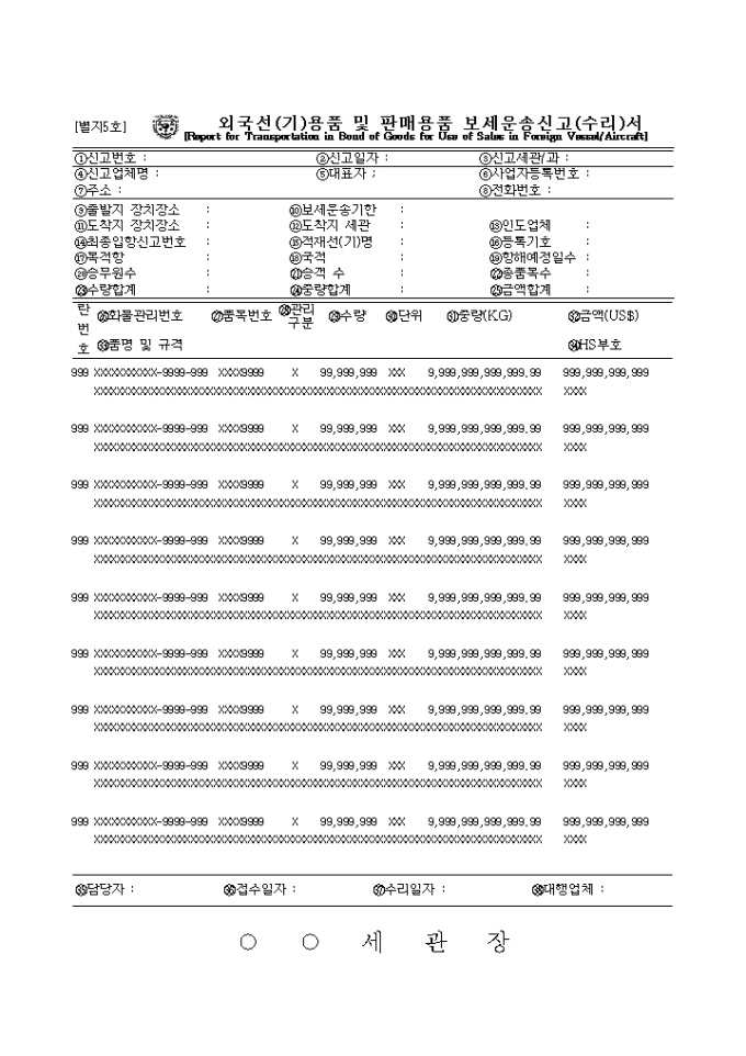 외국선(기) 용품 및 판매용품의 보세운송 발생시 세관장에게 신고를 하기 위한 양식입니다.