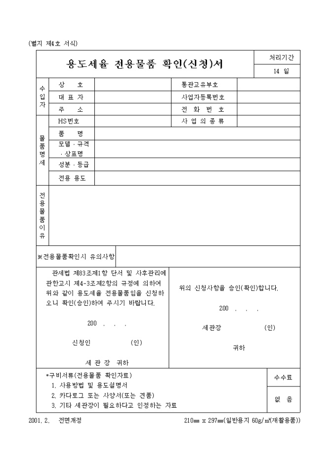 용도세율 전용물품 확인(신청)서2001.2